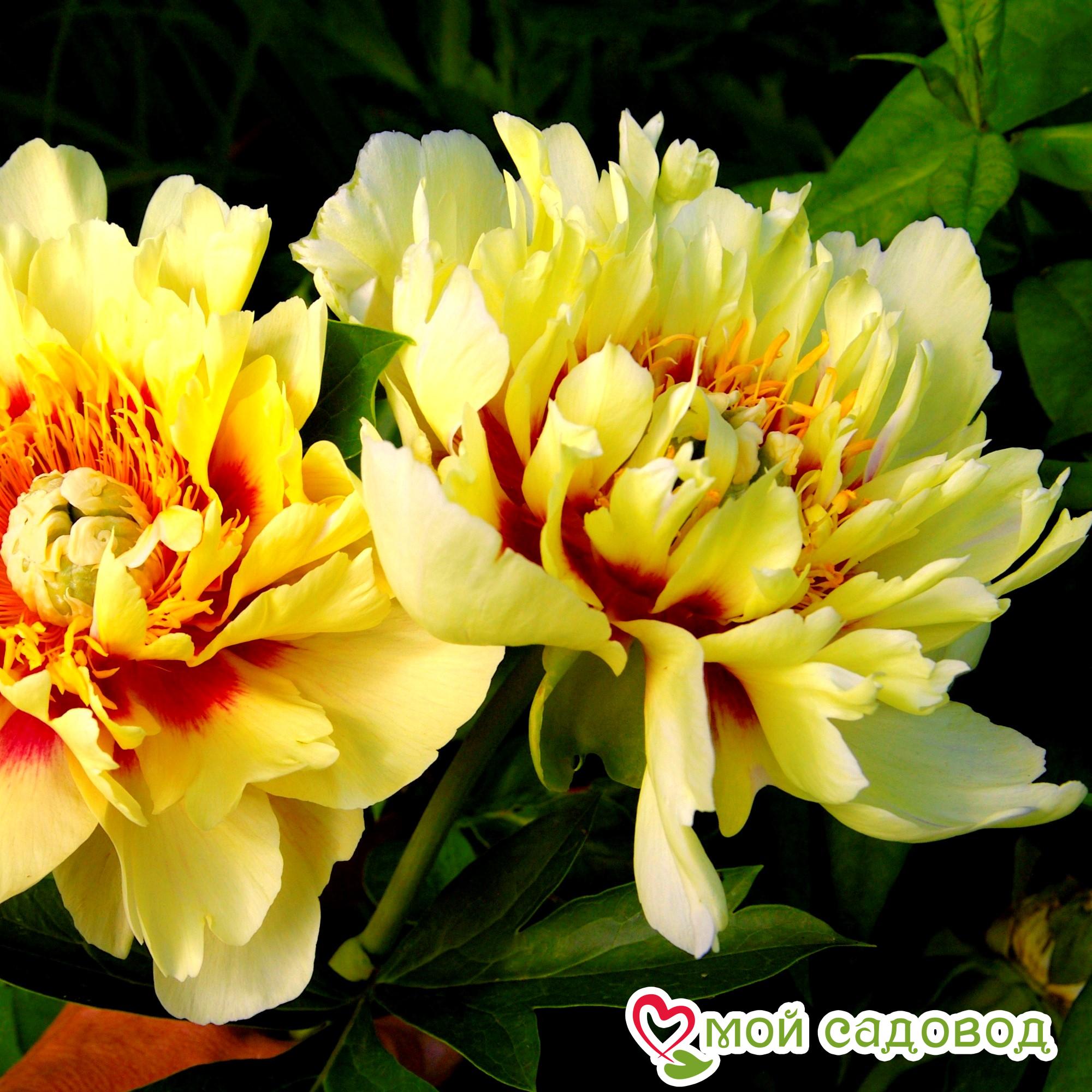 Полумахровый. Цветок среднего размера, жёлтый, более бледный на краях, с заметными пестиками. Лепестки с большими красными пятнами в основании. Похож на сорт «Бардзелла». Стебли жёсткие, выгибаются горизонтально и формируют низкий куст высотой 50 см, шириной 120 см и более. Диаметр цветка 18 см. Отличительные тёмно-сине-зелёные большие листья держатся до морозов. Очень выносливый и зимостойкий. Цветёт обильно июнь- июль. Место посадки Для посадки пионов понадобится защищенное от ветров место с хорошей освещенностью. Сорта светлой окраски, а также пионы с простыми и полумахровыми цветками можно посадить на частично затеняемом участке, это продлит цветение и защитит цветы от выгорания. Почва для посадки Залог успешного цветения пиона в будущем — это подготовка почвы! 1. Подготовка ямы — 70*70 см на скудных песчанистых и торфянистых почвах — 50*50 см на плодородных, окультуренных почвах. ХРАНЕНИЕ ДО ПОСАДКИ: После получения посылки, рекомендуем вскрыть пакет и осмотреть корневище. Почки должны быть плотные и розового цвета. Так же уделите внимание самому корневищу, все сомнительные, потемневшие, сморщенные части удалите, а места среза обработайте зеленкой или залой. Если почки еще не тронулись в рост, а высаживать в открытый почву рано, советуем Вам хранить корневище в холодильнике, обязательно оставляя его в пакете с торфяной смесью или в коробке под снегом. Если почки успели раскрыться это не критично, сохранить до посадки их так же возможно, высадите корень пиона в большой просторный горшок или в любую другую ёмкость.